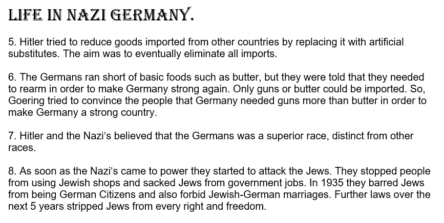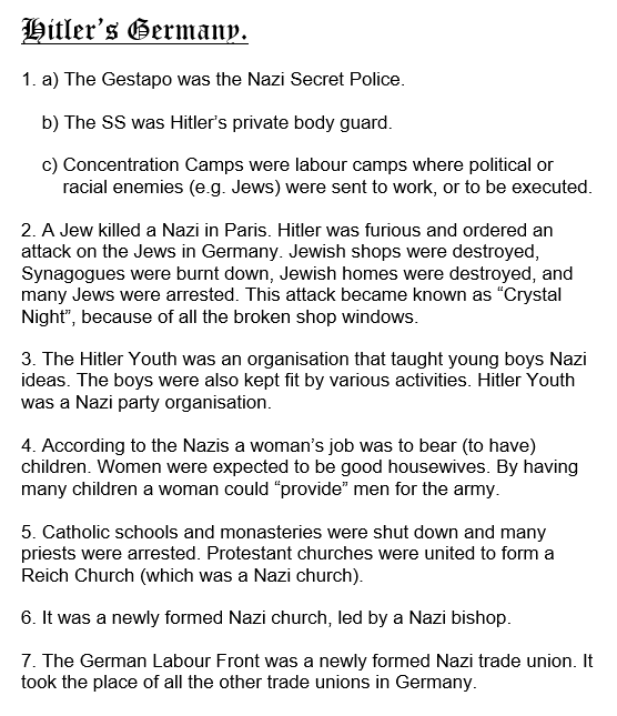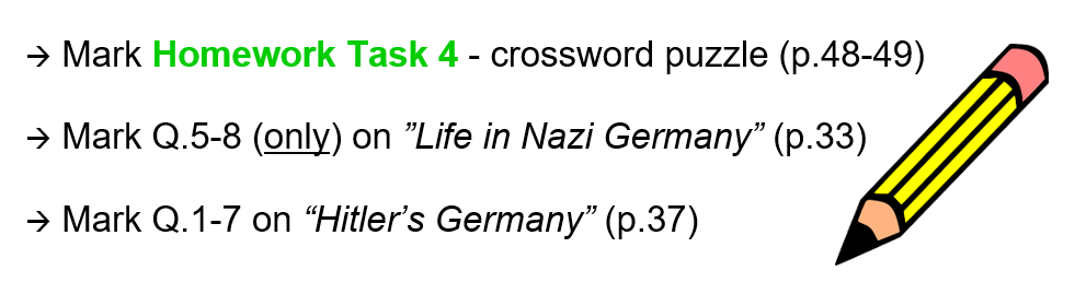 Take a picture of Q.1-4 of ”Life in Nazi Germany” (p.33), to send to me. (The picture must be clear because I will use it to assess your work and give you a mark.)