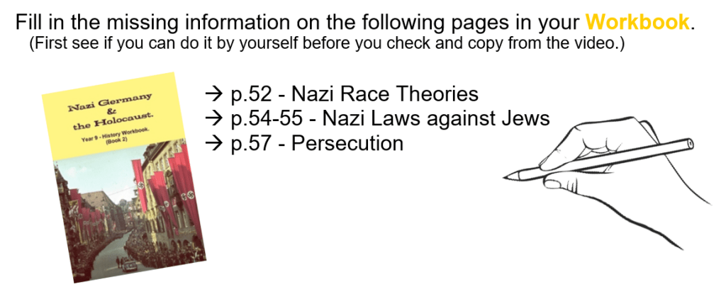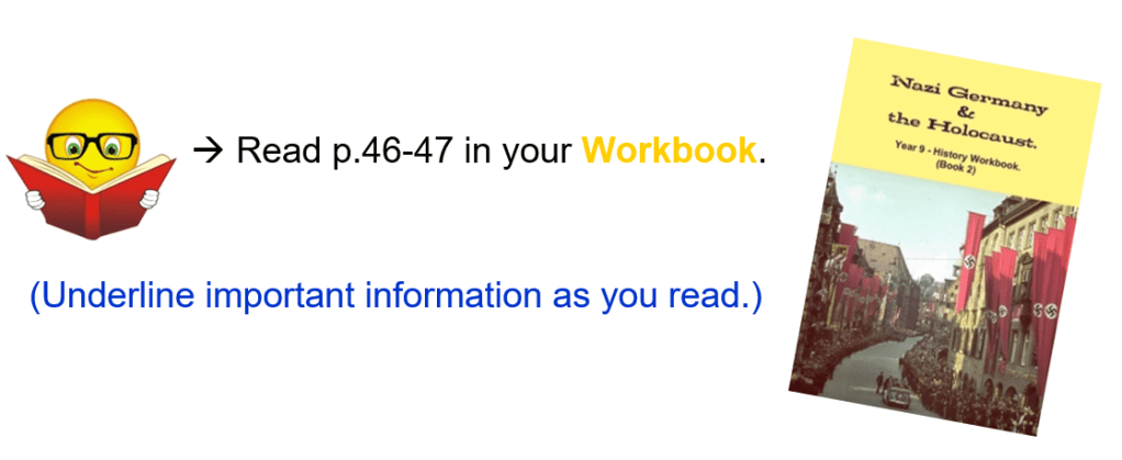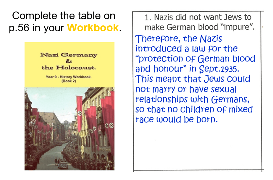 Complete the table on p.56 in your Workbook. You have to say how the Nazis used their anti-Jewish laws to achieve the aims mentioned in each of the 4 boxes. I have done the first one for you, as an example. (You can just copy down the first one.)