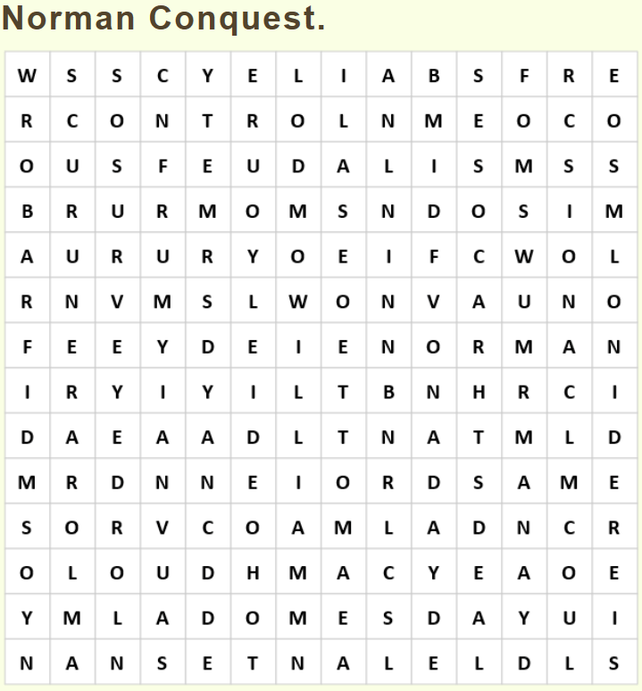 If there is still time, do the following word search ONLINE about the Norman Invasion and Conquest. You need to look for 10 words that you would have to use if you want to describe changes that took place in England after the Norman Conquest. Click on the word search to be able do it online – you can then “highlight” the words with the cursor as you find them.