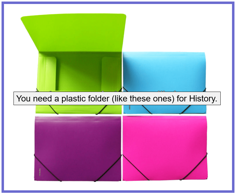 You should also have taken note of the plastic folder required to keep all your History books in! You must always have the folder plus the 3 books in class when you have History.