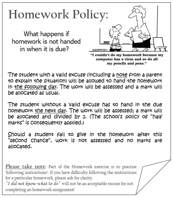 4) The school’s homework policy encourages students to hand in homework on time. (If not, you will lose marks or even get zero!)