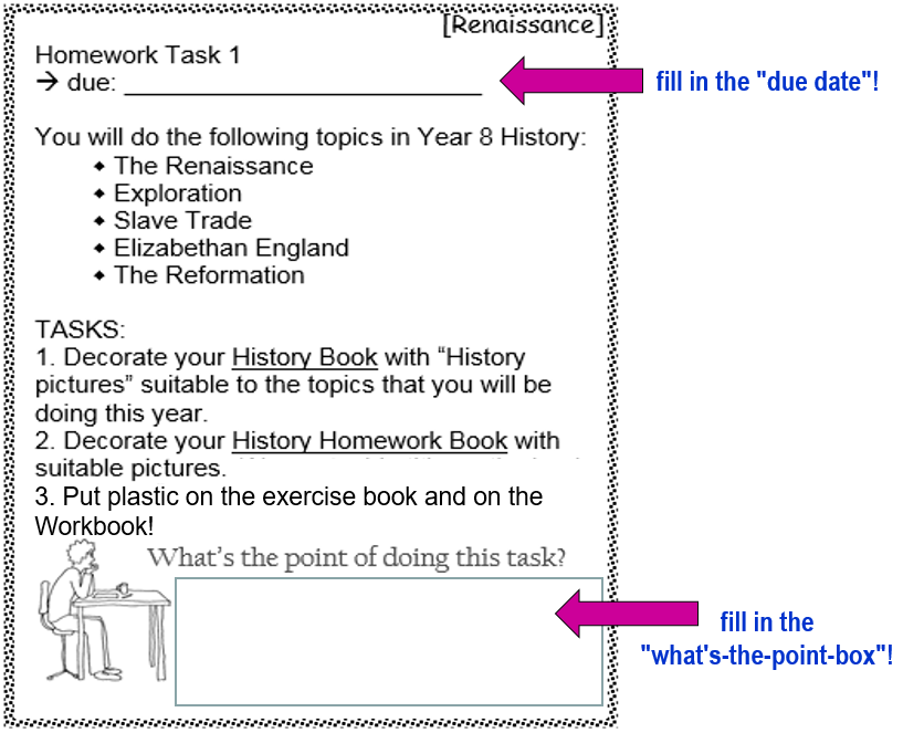 For all homework tasks, always fill in the “due date” as well as the “what’s-the-point-box”! For example:
