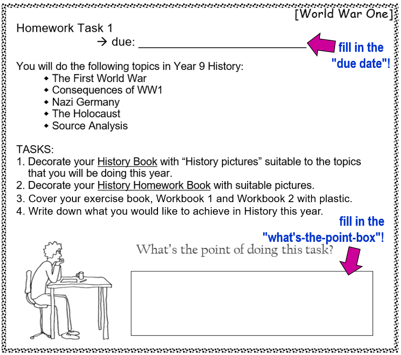 For all homework tasks, always fill in the “due date” as well as the “what’s-the-point-box”! For example: