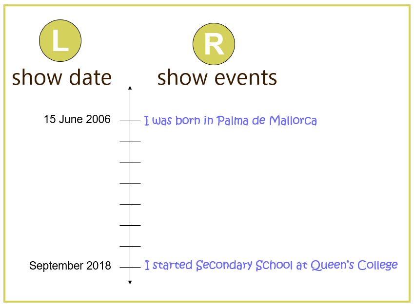 Make a timeline of your life so far…. (You may need to ask your parents to remind you about important events that took place in your life.) Remember that dates go on the left side of the line and events go on the right side of the line. Write in full sentences. Start at the top and write the events in chronological order.