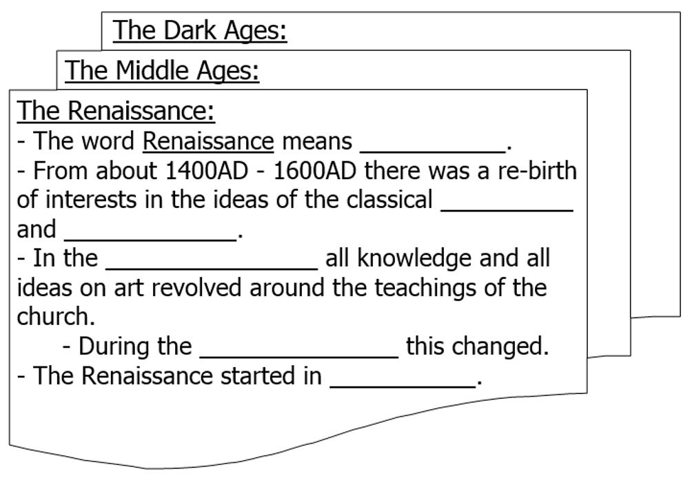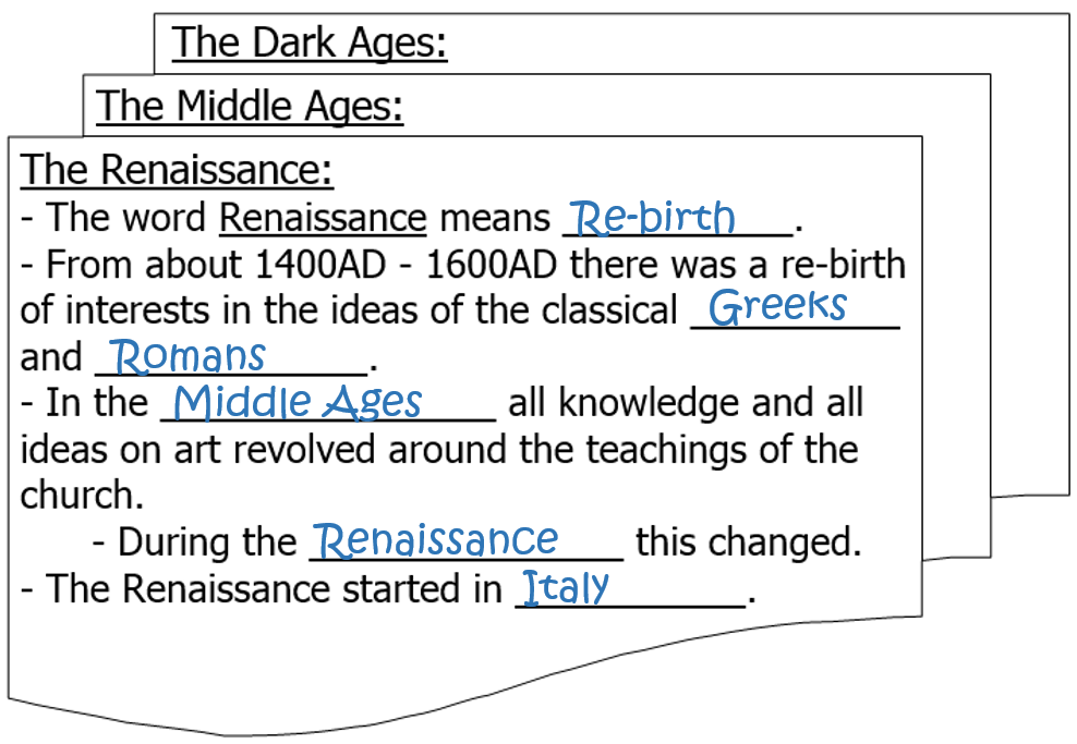 Go to page 4 and complete the missing information on these notes about the Renaissance: