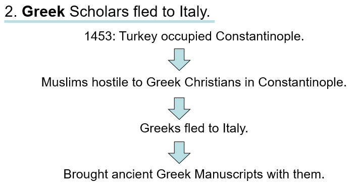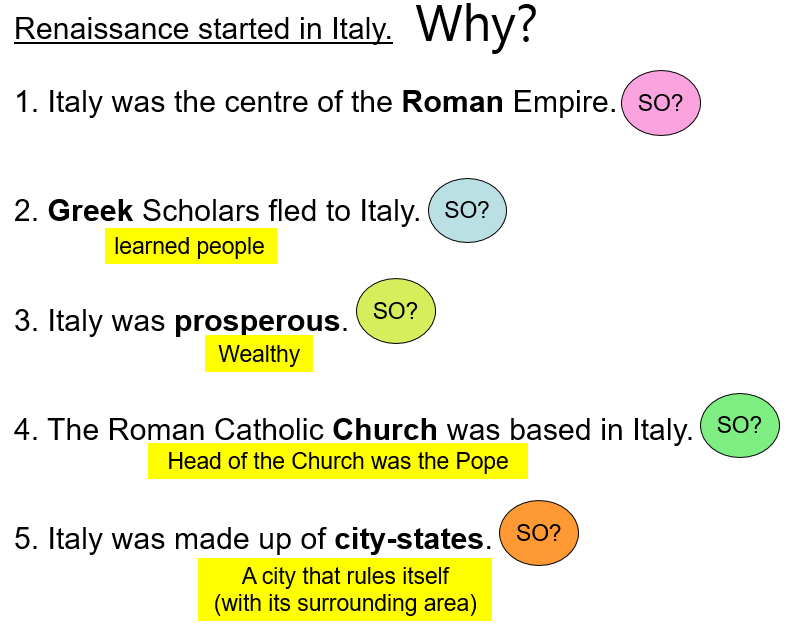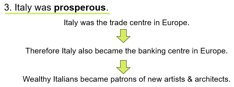 It is not good enough to know the reasons… You are expected to understand and explain the reasons. Therefore, look at the following explanation and see if you will be able to use these slides to explain to someone why the Renaissance started in Italy.