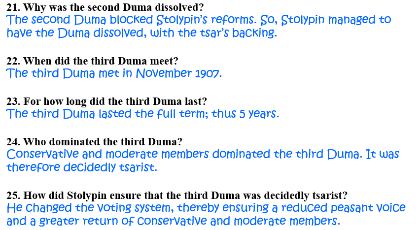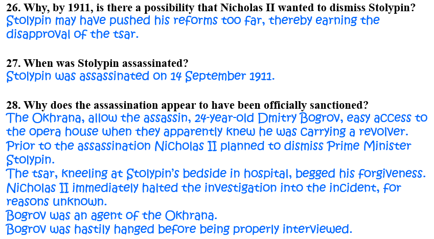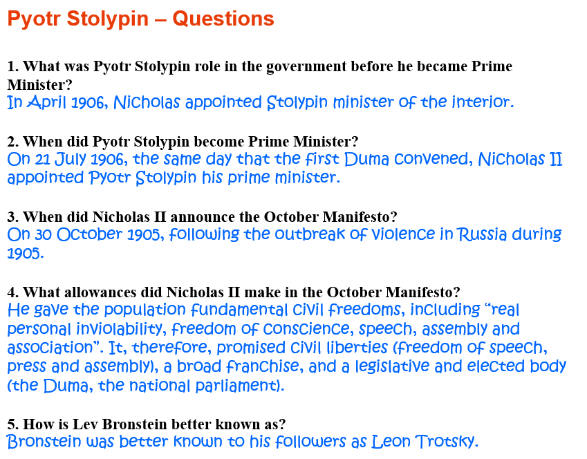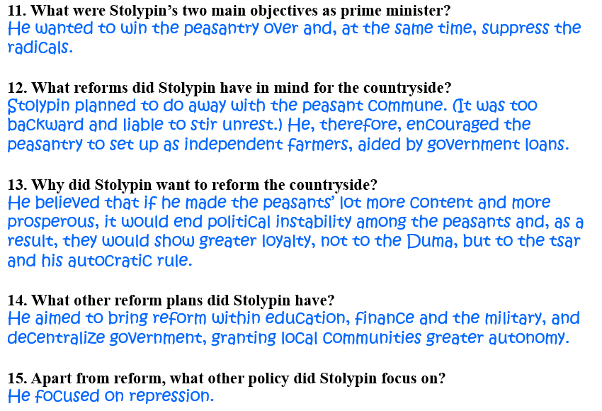 Use the rest of this lesson to finish the questions on Stolypin (page 10 of your Russian booklet). You need to finish them about 10 minutes before the end of the lesson as we will also mark the questions in class today.