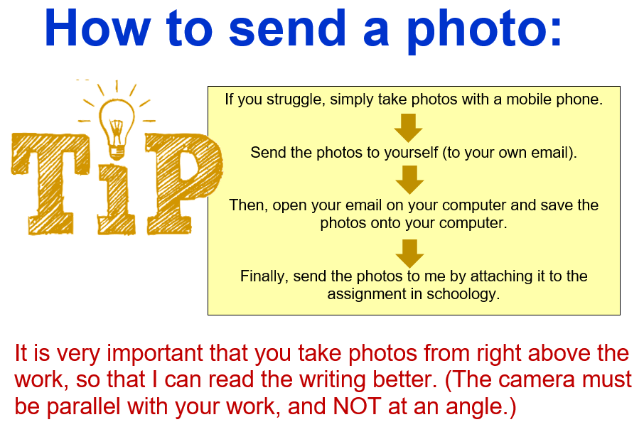 Remember to send your “assignment” to me in Schoology!! ONLY SEND ME A PHOTO OF WHAT I ASKED FOR!! Also, your work must not be submitted late.. as this may result in half marks or even in zero…!!