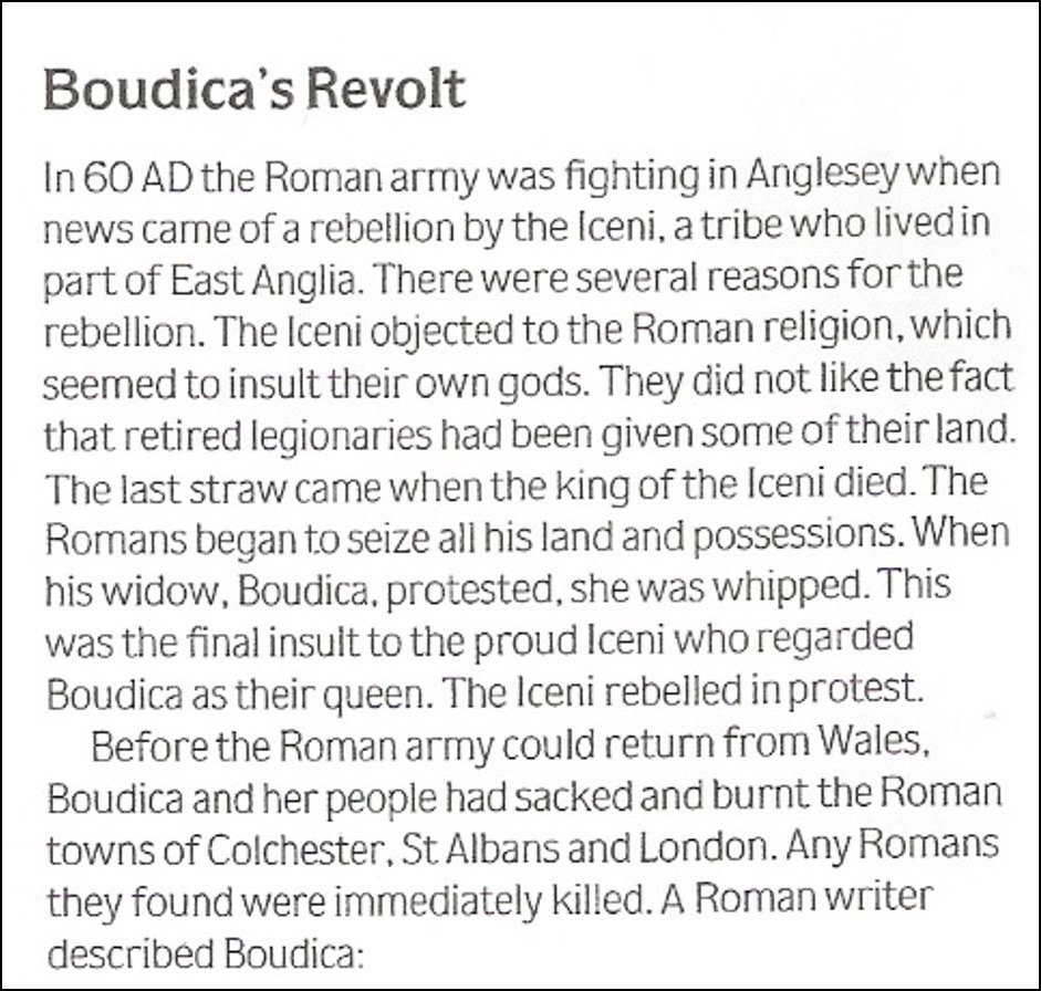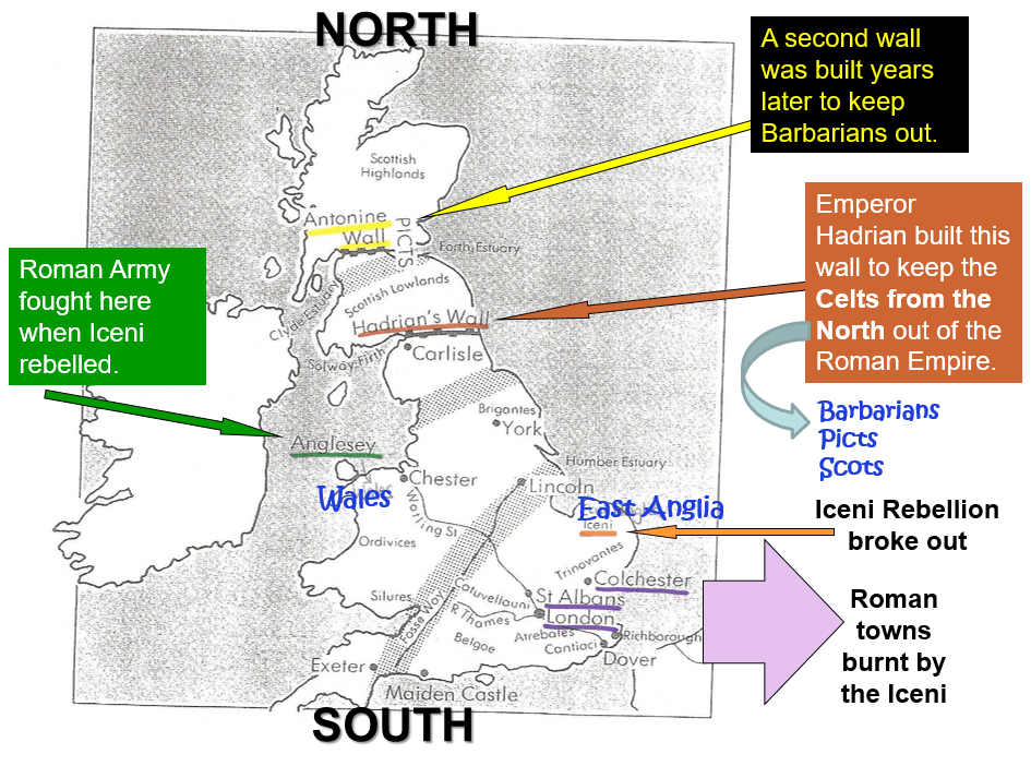 Not all the Celts welcomed Roman rule in Britain. Some Celts moved away from the areas ruled by the Romans. (For example, they moved to the west, to Wales, to Ireland and to Scotland.) Other Celtic tribes fought against the Romans to drive them out of Britain. Unfortunately, these tribes were defeated by the Roman armies. Let’s look at resistance to Roman rule in a bit more detail: