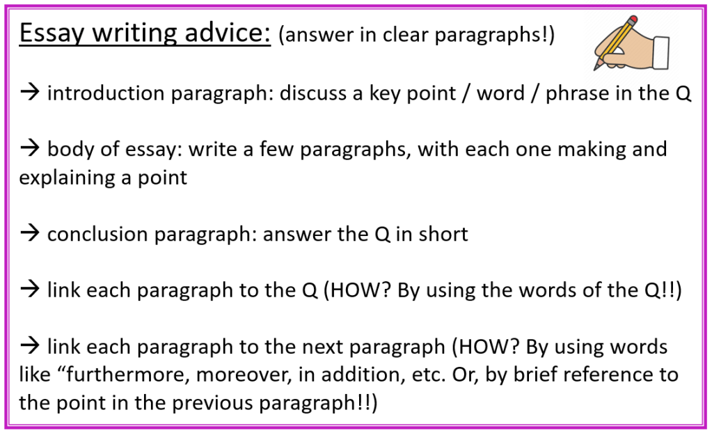 The following essay writing advice is VERY important – read the advice very carefully and make sure that you follow it whenever you have to complete an essay!!