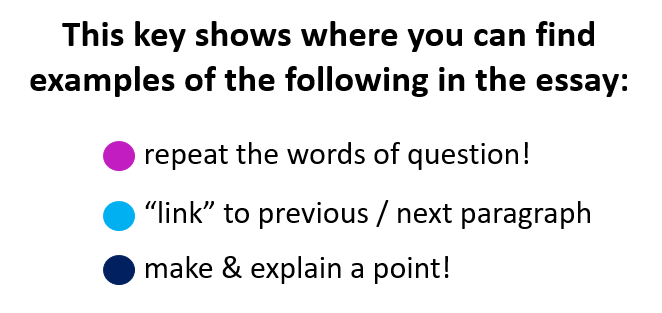 Have a careful look at the following example answer. It shows you how paragraphs can be linked to each other and it also shows you how to use the words of the question throughout your answer.