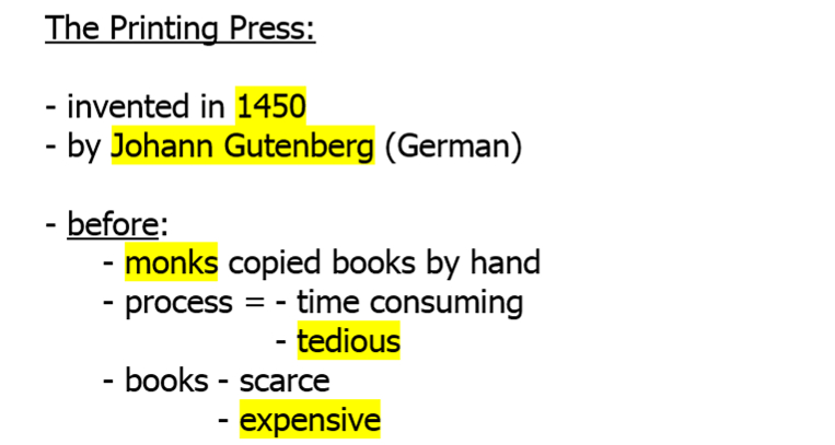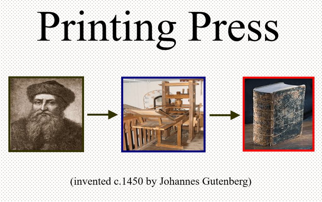 Printing Press: “an invention that could produce numerous copies of a page – it could therefore mass produce printed books”