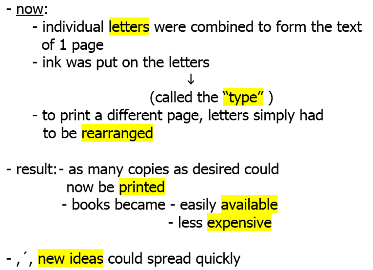 Once a way of mass producing books was discovered, new ideas related to art, architecture and science quickly spread across Europe. This happened round about 1450, when a German man invented the so-called printing press!