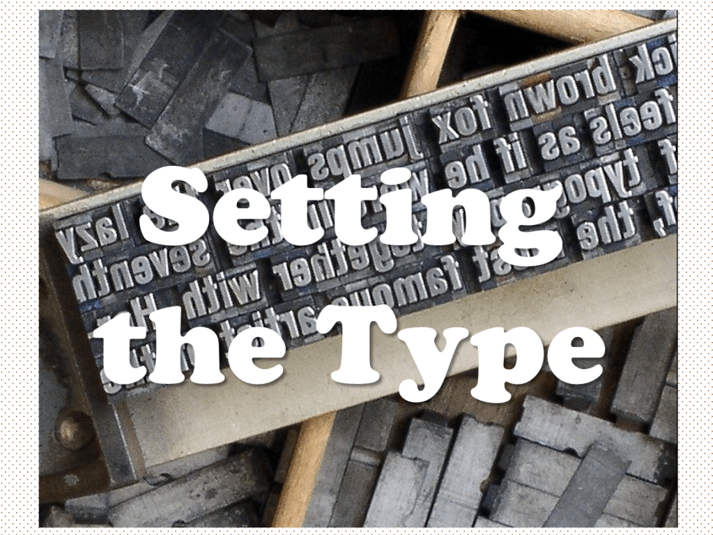 “Setting the type” refers the process of putting the letters in the correct order to make words, sentences, paragraphs – and ultimately to form the pages of a book!