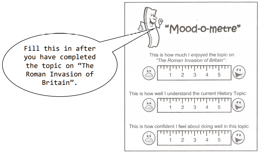 First, complete the “mood-o-metre” (on p.3) to show how you feel about the topic on “The Roman Invasion of Britain” …!