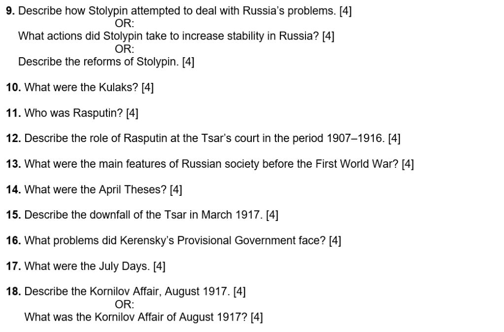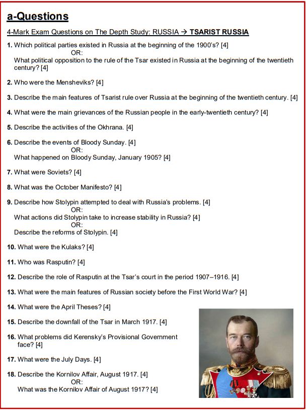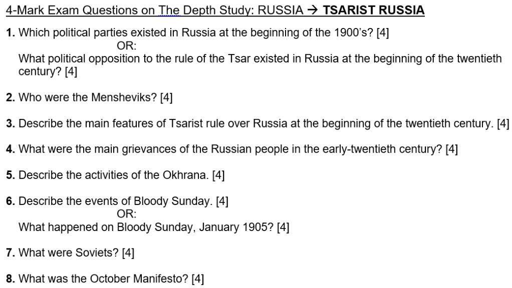 Here is the original list of typical 4-mark exam questions on Tsarist Russia: