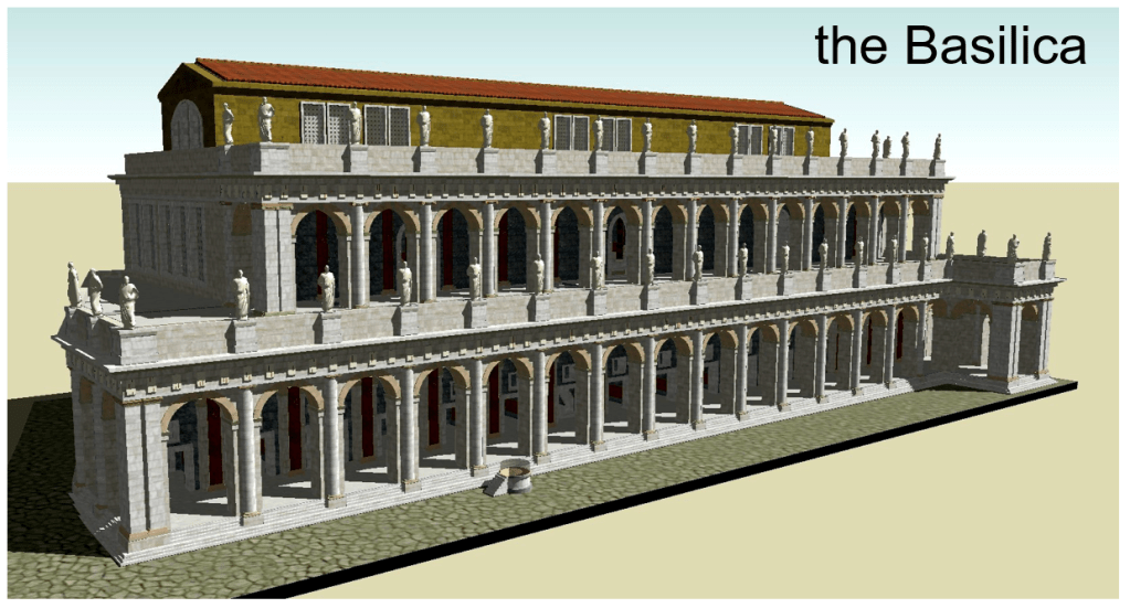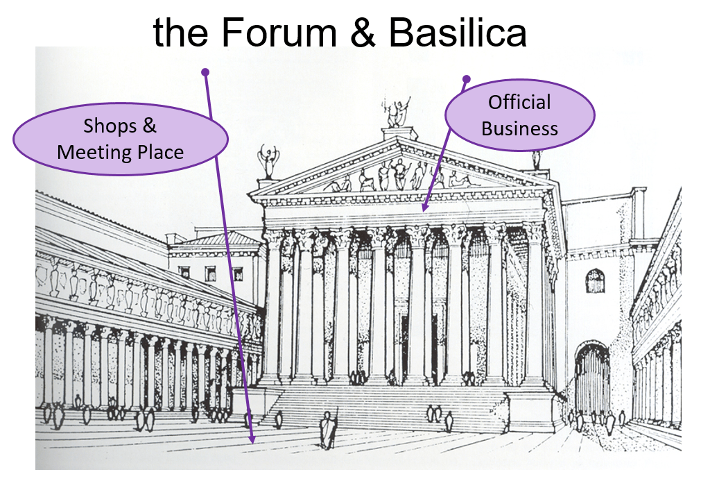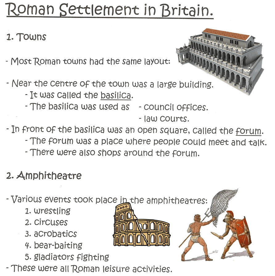 The text mentions the basilica, the forum and amphitheaters. Below, you can see pictures of these buildings that formed part of Roman Towns.