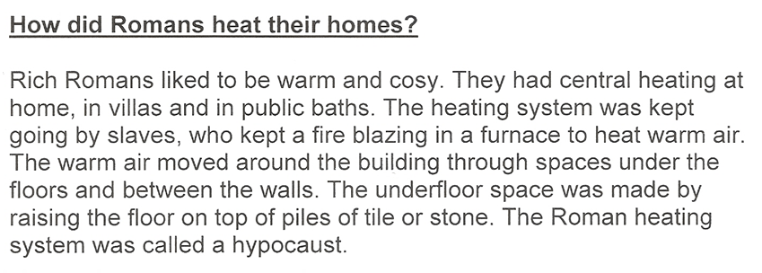 Compare Roman ways with our ways of heating the home. (The Roman way of heating homes is not that much different to our modern day ways of making our homes warm! Or is it?)