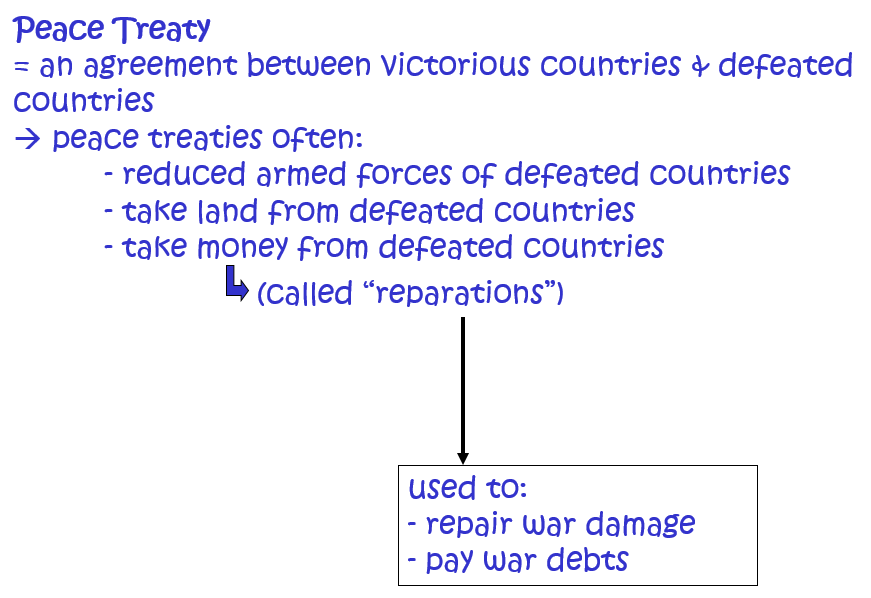 As you have heard in the previous lesson, after WW1 representatives of the victorious countries met in France to draw up peace treaties that the defeated countries had to sign. The treaty that Germany had to sign is known as the Treaty of Versailles. The video below explains briefly what this treaty was all about.