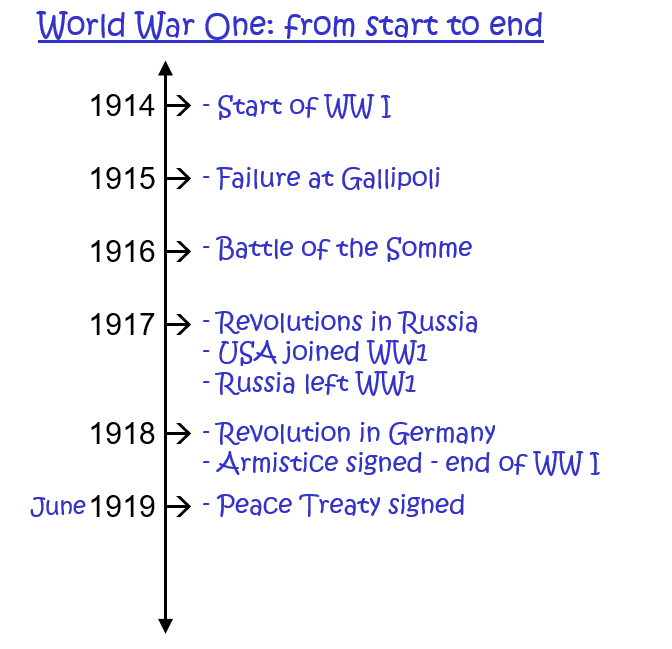 So, in January 1919 representatives from the Allies met in Paris, at Palace of Versailles, to draw up the peace treaty with Germany. The conference was dominated by Britain, France and the USA. The treaty was only finalized and signed in June 1919. The flow-chart below clarifies dates that you need to be familiar with: