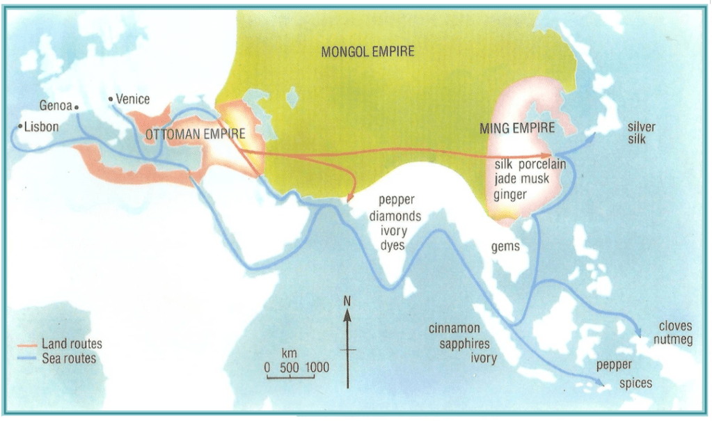 Now, carefully examine the map below. It shows trading goods and trading routes to the Far East… There are some sea routes (indicated in blue) and some land routes (indicated in red). There came a time that Europeans could no longer safely make use of these trading routes… (You will learn about his in a subsequent lesson.)