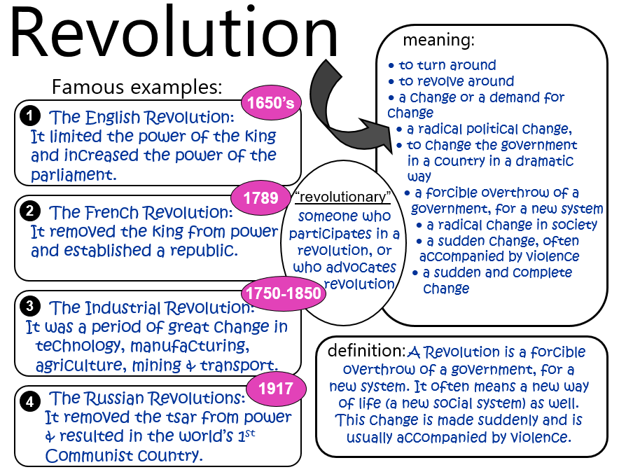 Part 3 of “Consequences of WW1” discusses the outbreak of revolutions as a consequence of WW1. Before we watch Part 3, let’s see what is meant by “revolution”.