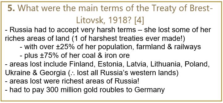 5. What were the main terms of the Treaty of Brest Litovsk, 1918? [4]