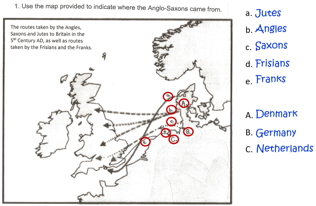 Doing Task 1: The map shows the routes taken by these tribes. You have to use the map provided to show where the Anglo-Saxons came from.