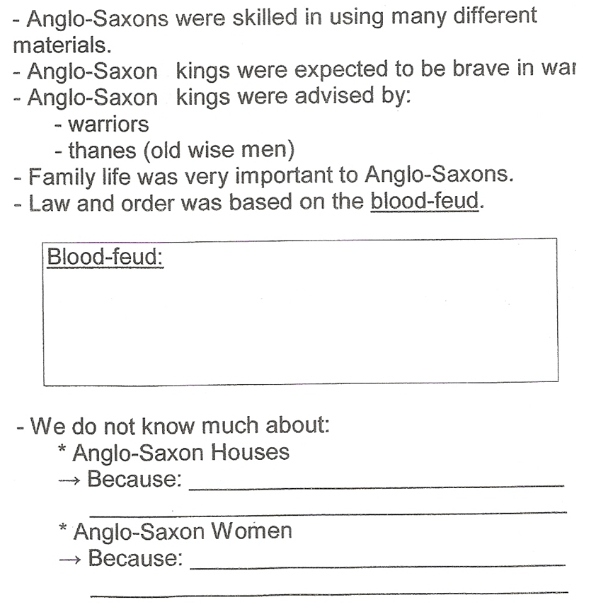 Fill in the missing words on the notes about Anglo-Saxon living, p.14.
