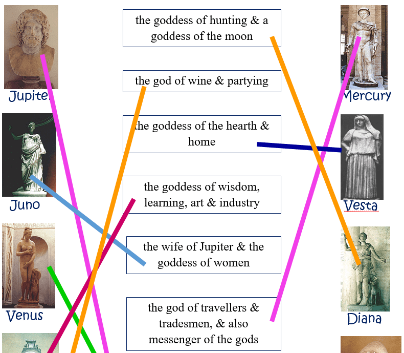 Now, complete the Task on p.49. You have to match the names of the Roman gods with the descriptions in the center of the page. (You can draw lines to connect the names and descriptions, or use different highlighters to show which names belong to which descriptions.)