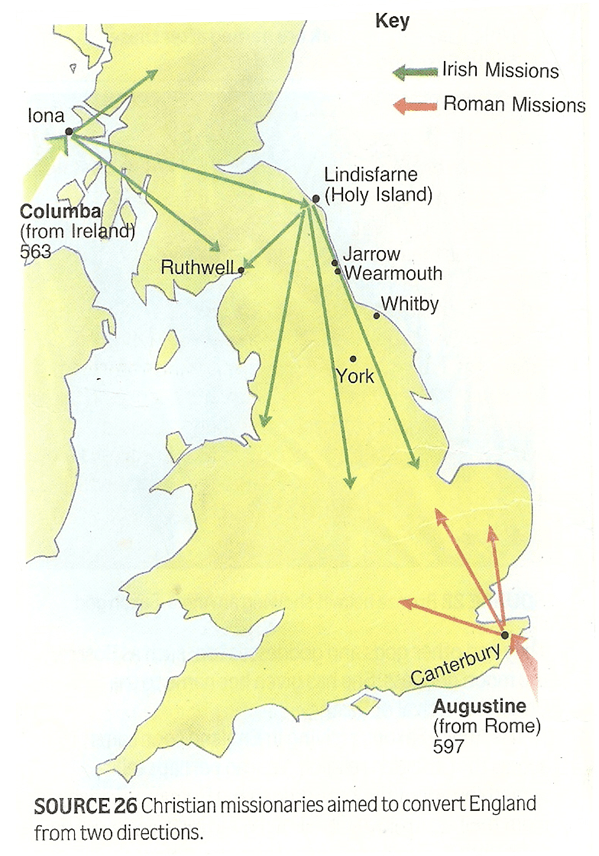 Use two different colours and indicate, in colour, the 2 directions from where England was converted to Christianity (on your black-and-white map, on p.55 in your Workbook). Remember to also add colour to the key of the map!