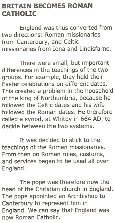 The video below explains how Britain became Roman Catholic in the 7th Century AD. For many centuries after this England remained Roman Catholic and was strongly influenced by the Roman Catholic Church. (It was only in the 16th Century, under King Henry VIII, that England broke away from the Roman Catholic Church.)