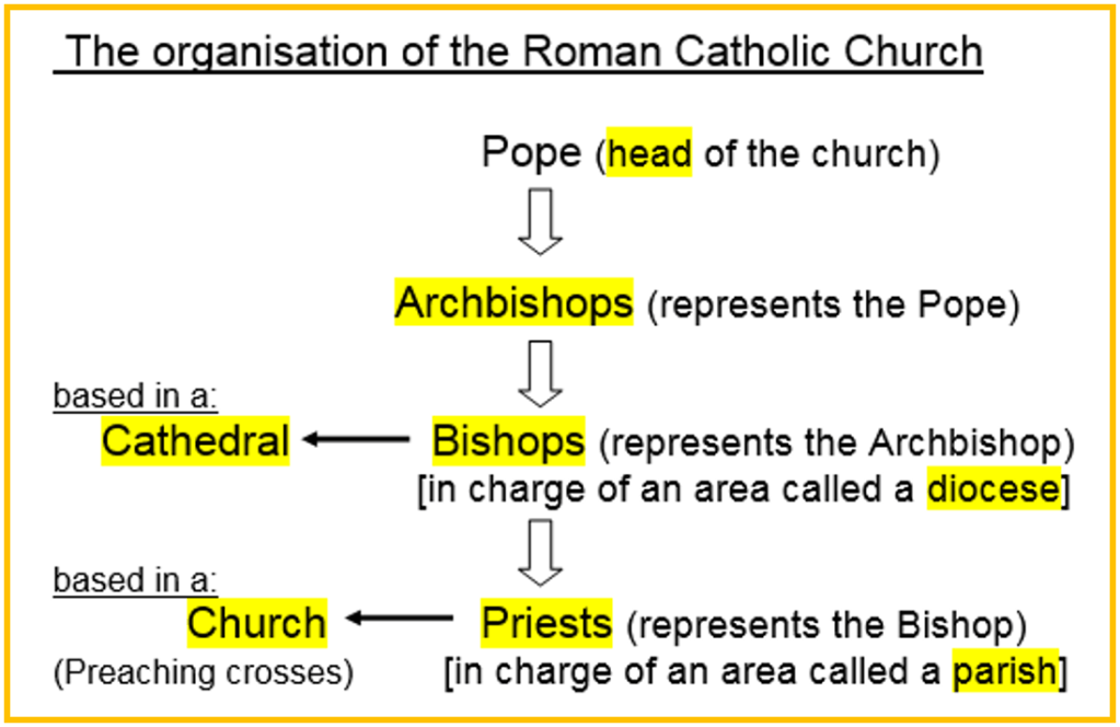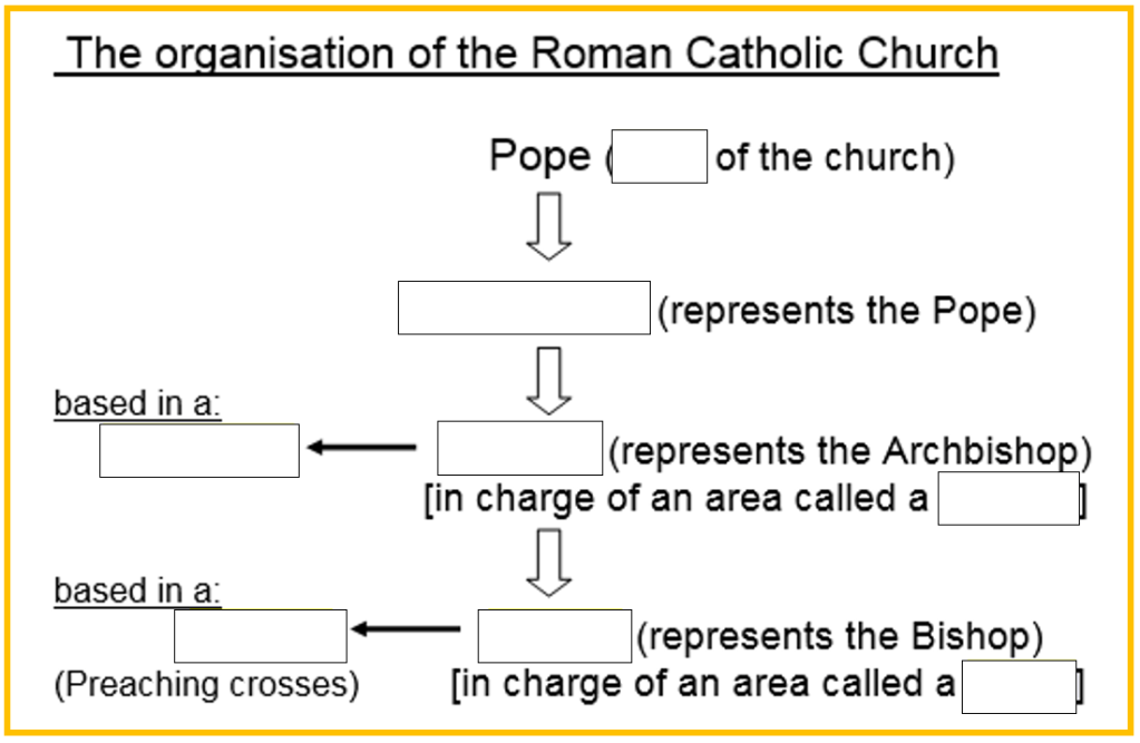 Complete the following worksheet (provided in class) to show how the organisation of the Roman Catholic Church – fill in the missing words: