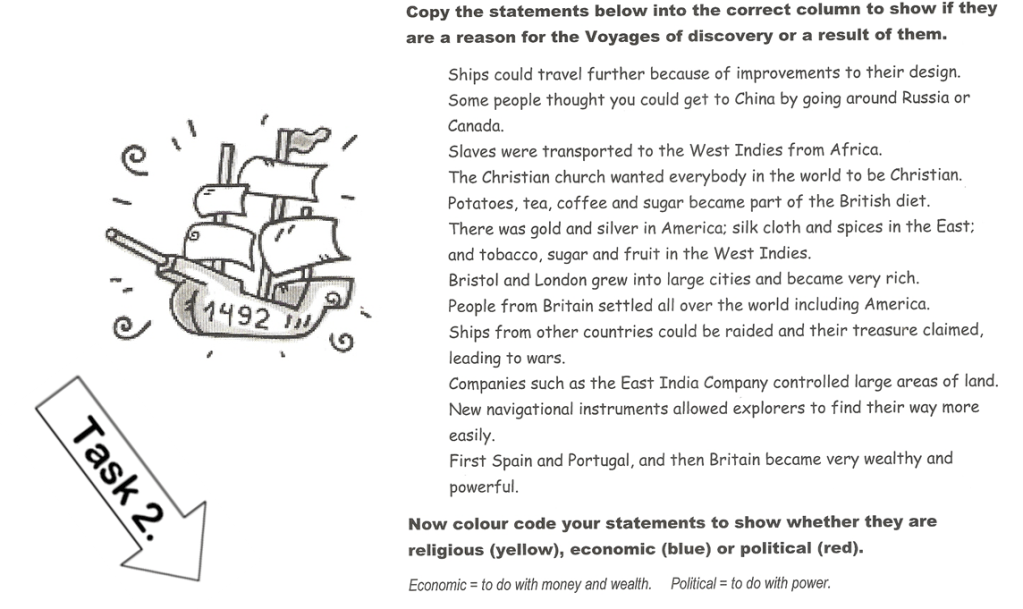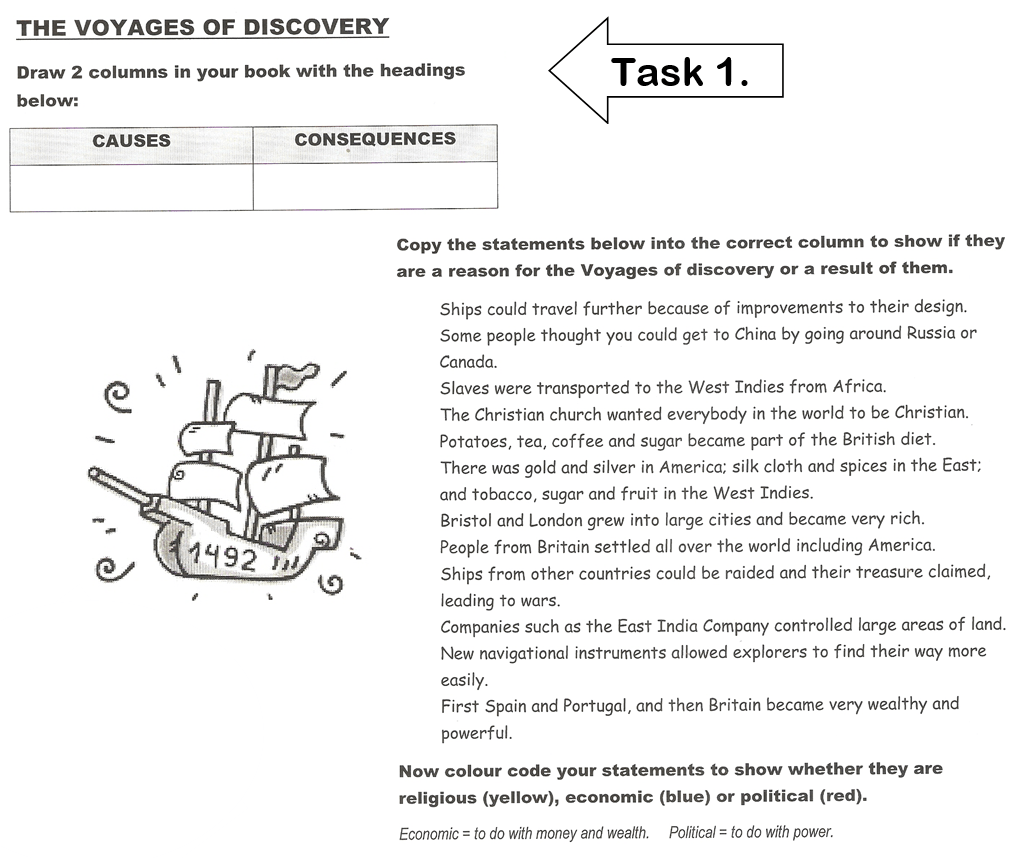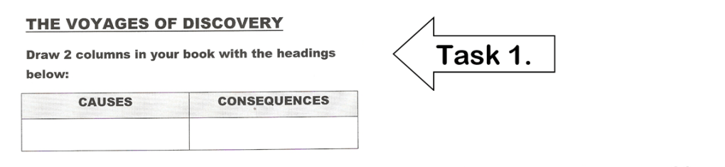 Copy the statements in Task 1 (p.42) into the correct column, to show if the statement is a reason for the Voyages of discovery or a result of them.