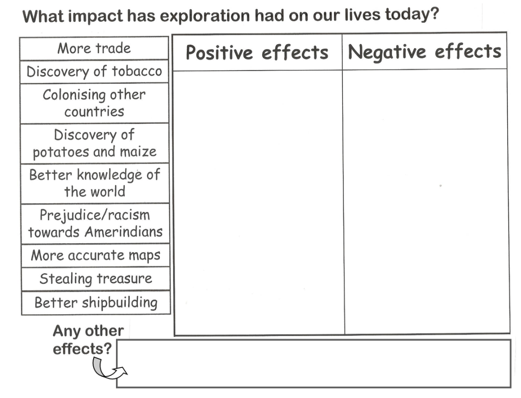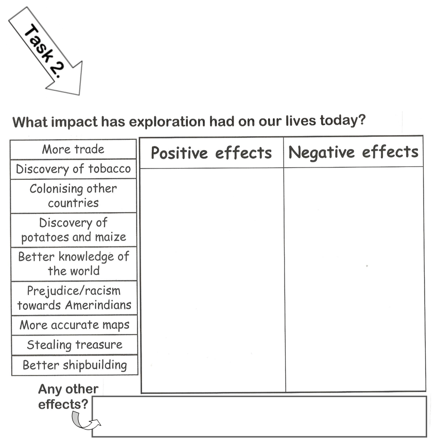 Look at the effects in the column on the left – they show the impact of exploration on our lives today. Identify the positive and negative effects and write them in the relevant columns in your Workbook. Finally, also complete the “any other effects” box!