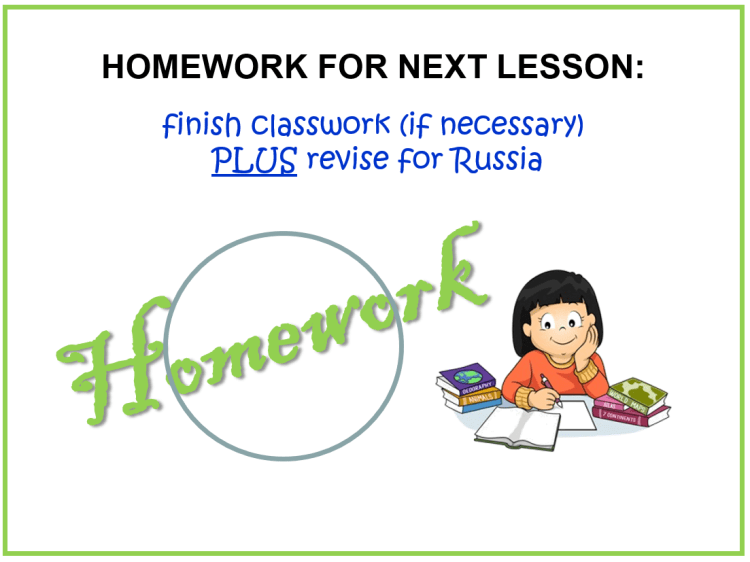 Finish today’s classwork (if necessary) PLUS revise Russian history for the next lesson!