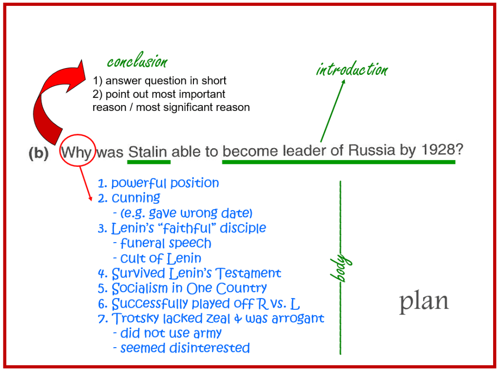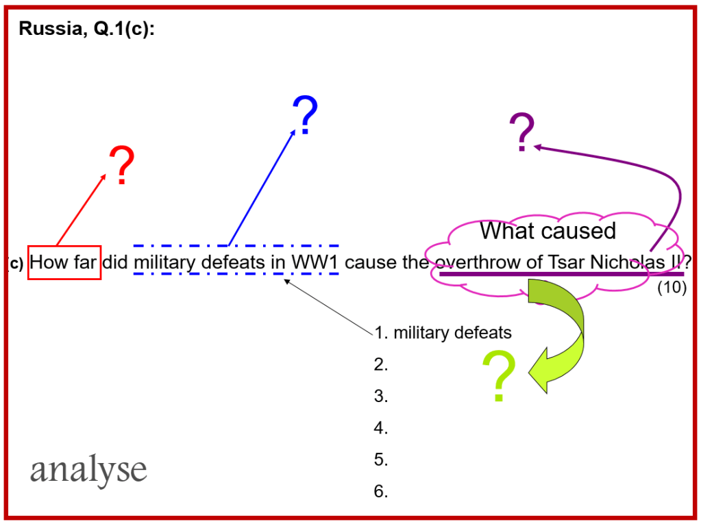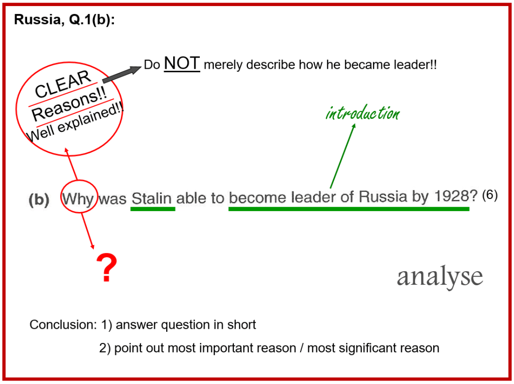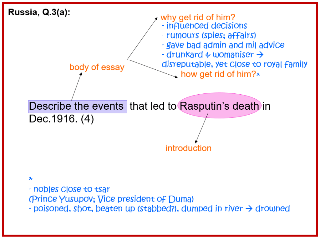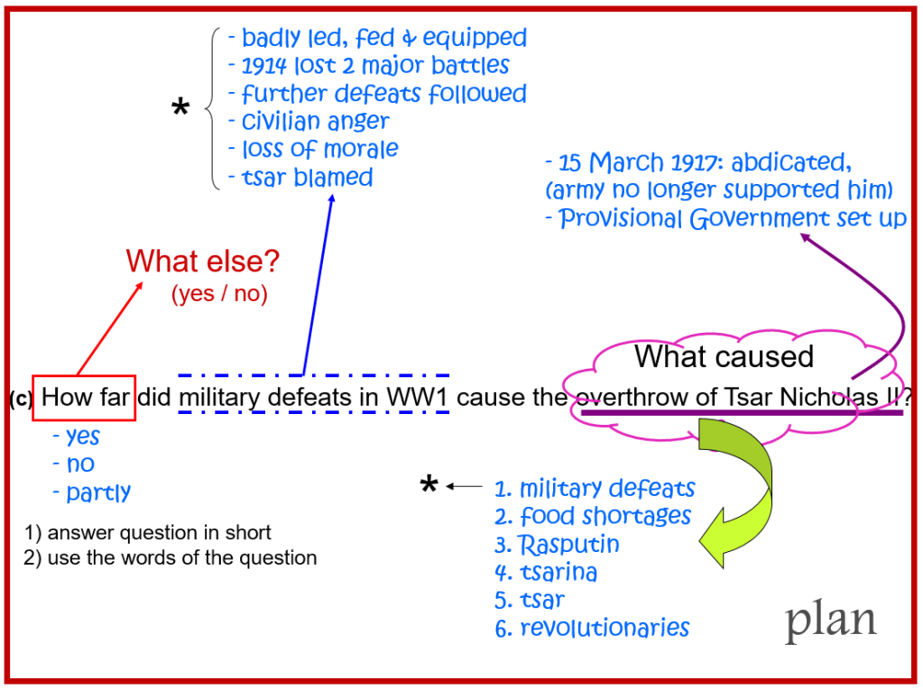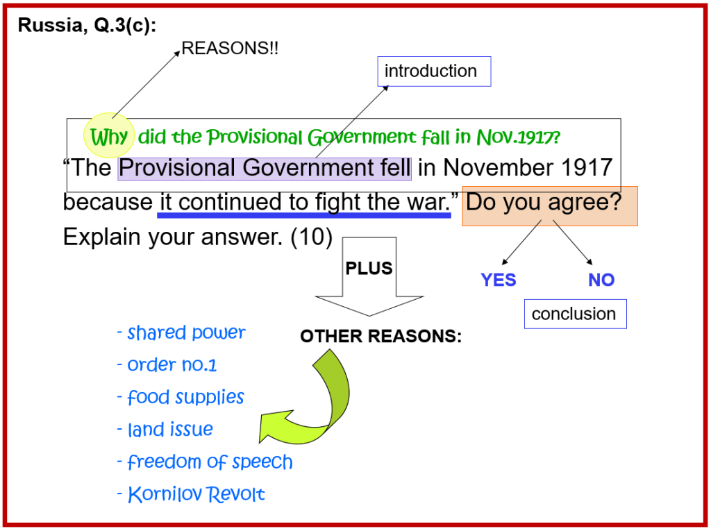 Let’s first look at the previous essay answers that you wrote on the Russian History (Russia, Q1). Stick your answers into your essay writing book. Then, navigate through the slides for feedback…