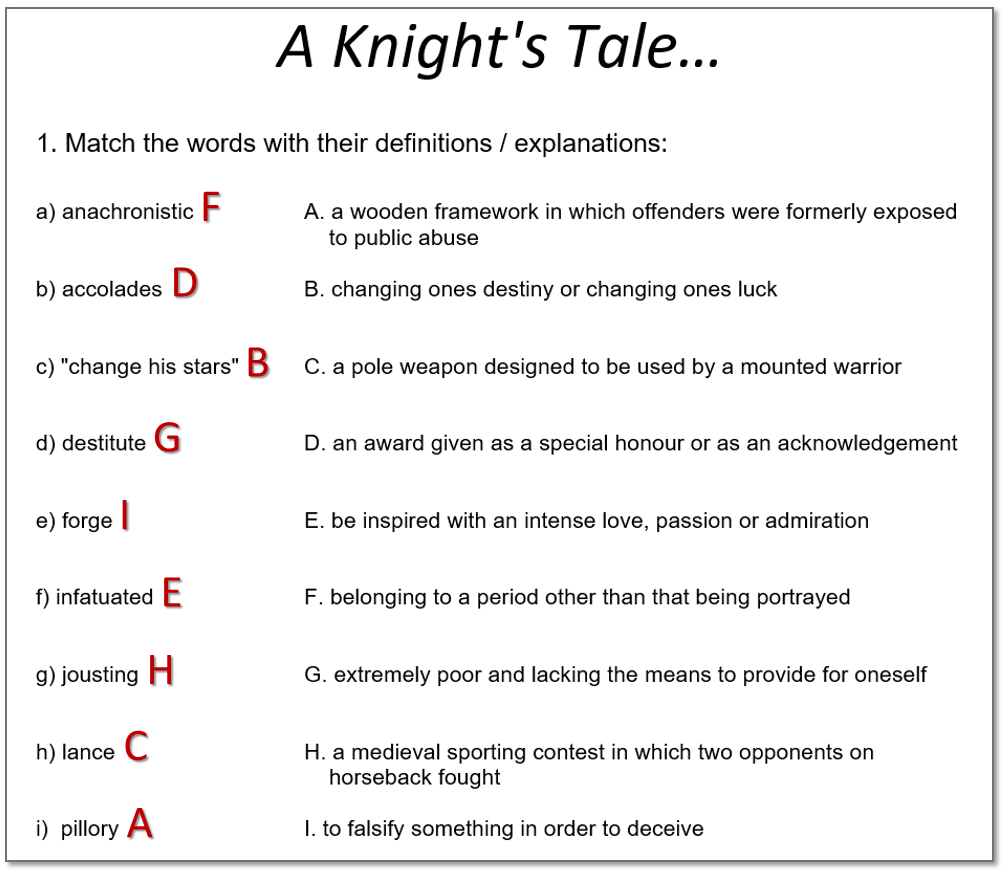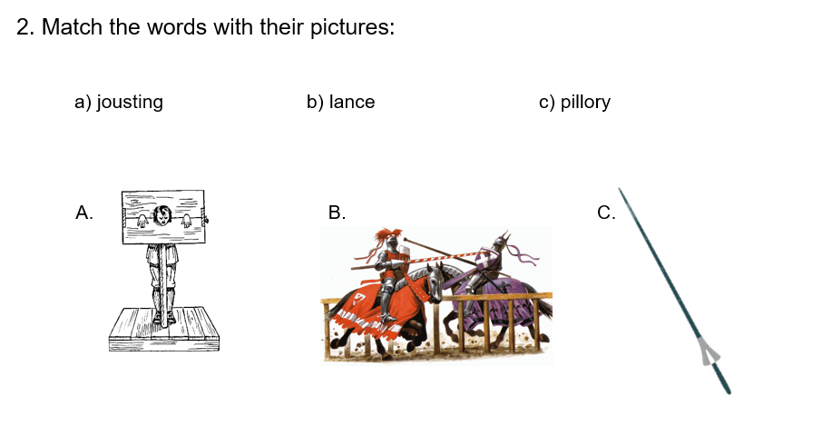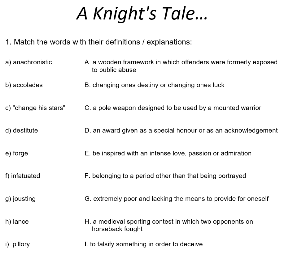 Again, there are words that you may need to know the meanings of: pillory, contestation, lineage, lance and “to knight“.