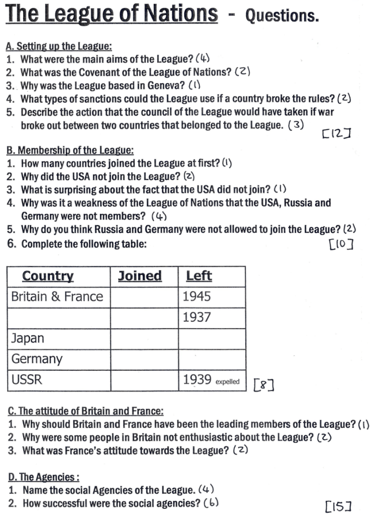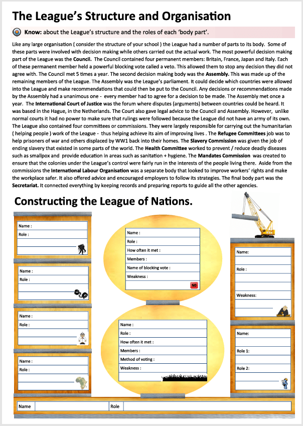 Stick the worksheet on the League of Nations (provided) into your book. Then answer the questions in point form.