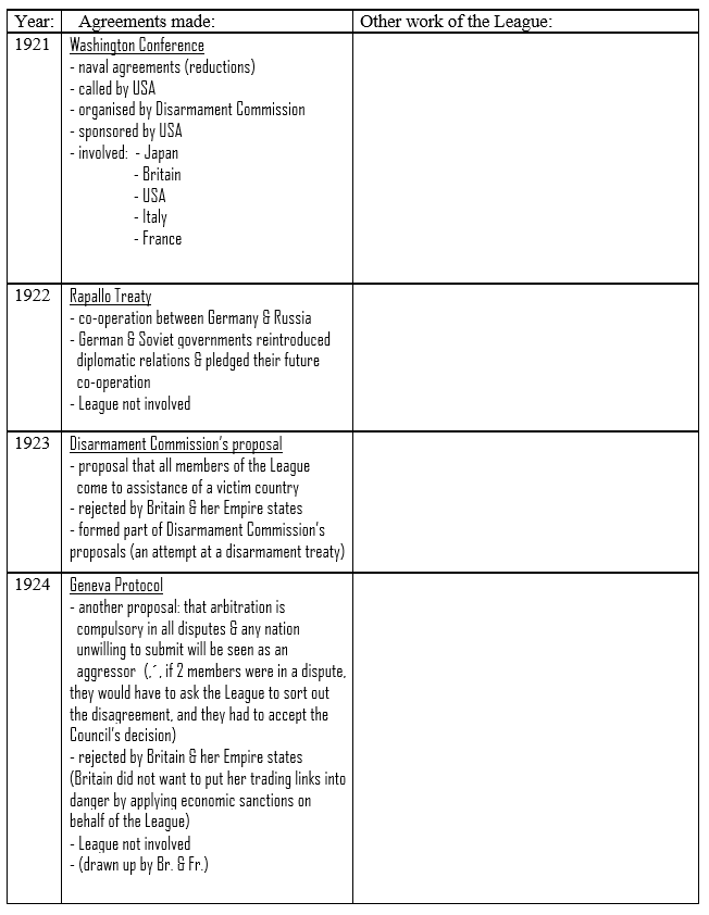 Complete the worksheet below to show all the agreements made (and attempted agreements) of the 1920’s: