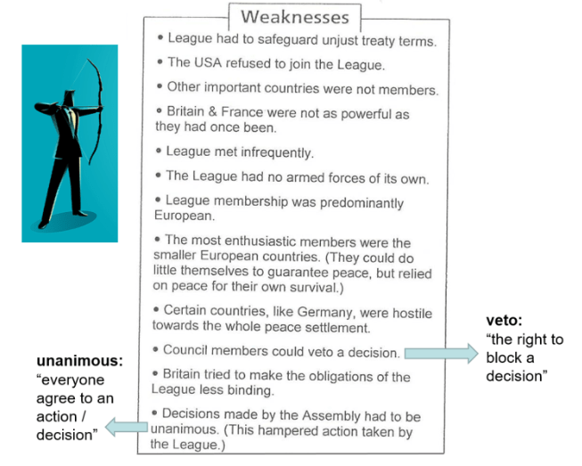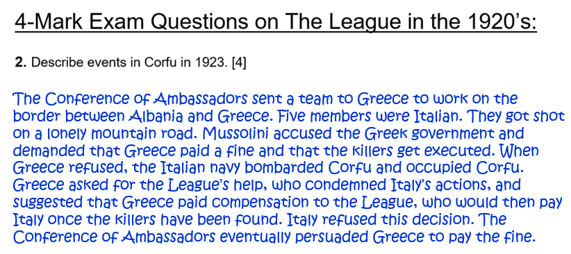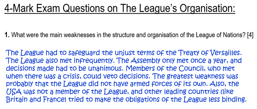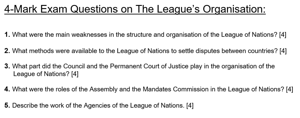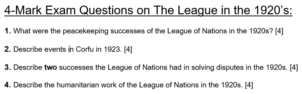 Below are typical 4-mark exam questions on The League in the 1920’s.