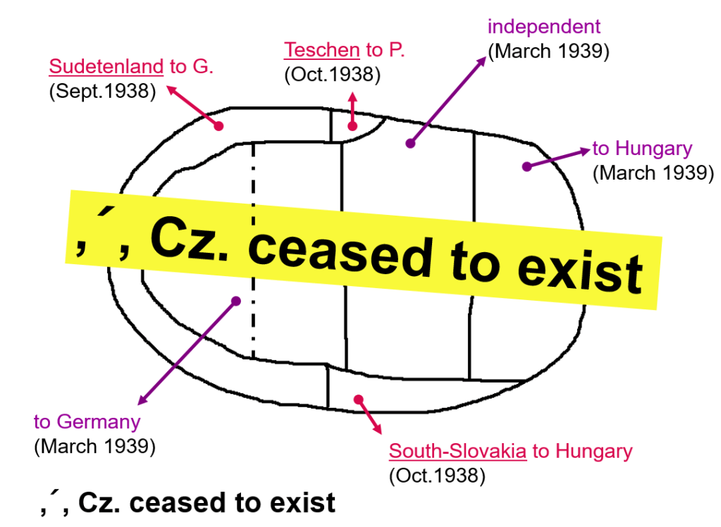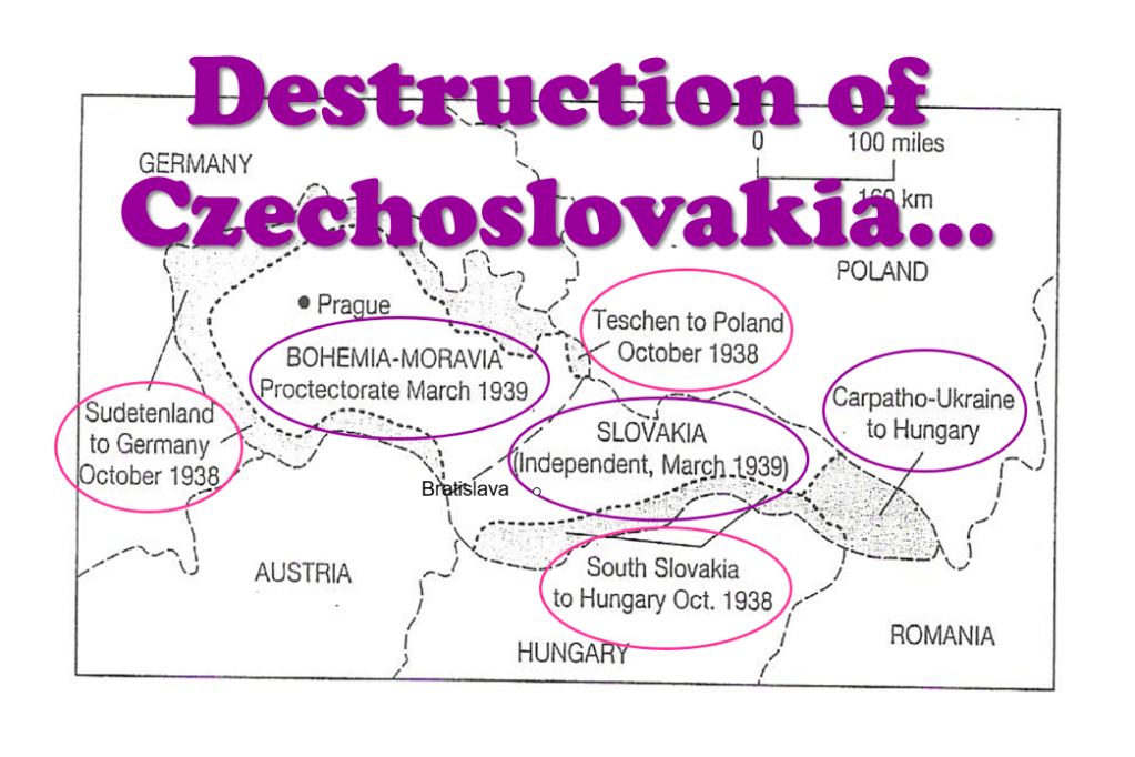 Use the diagram below (provided) to show how the destruction of Czechoslovakia took place… (Label the areas and say when each was taken from Czechoslovakia and to which countries the areas were given.)