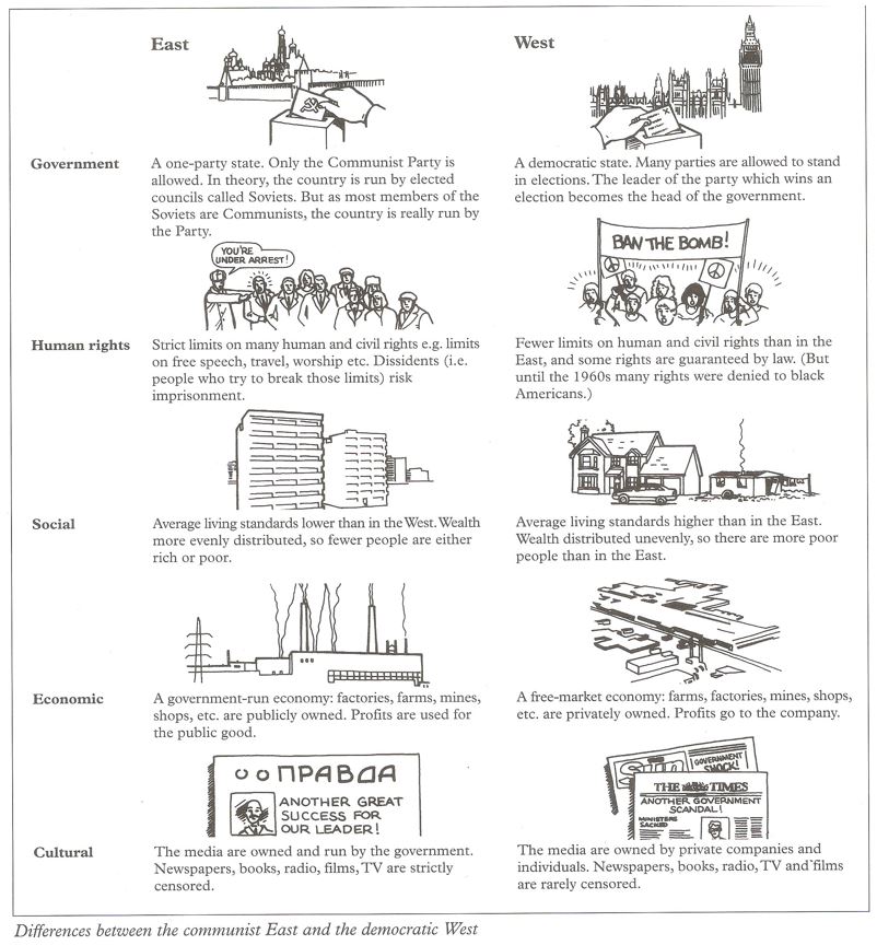 The diagram below shows how life in East contrasted to life in the West: