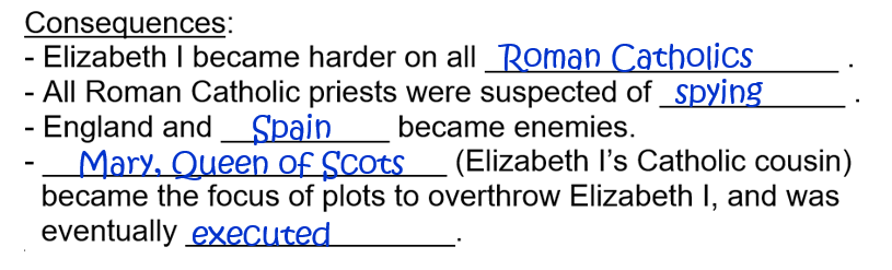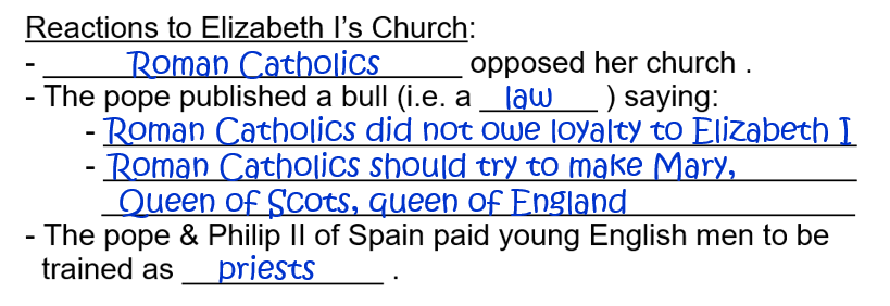 Fill in the missing information on the notes about the “Elizabethan Religious Settlement”, on p.60.