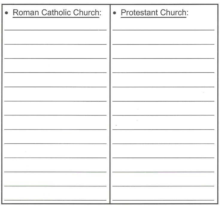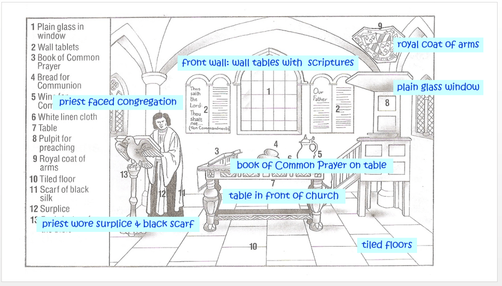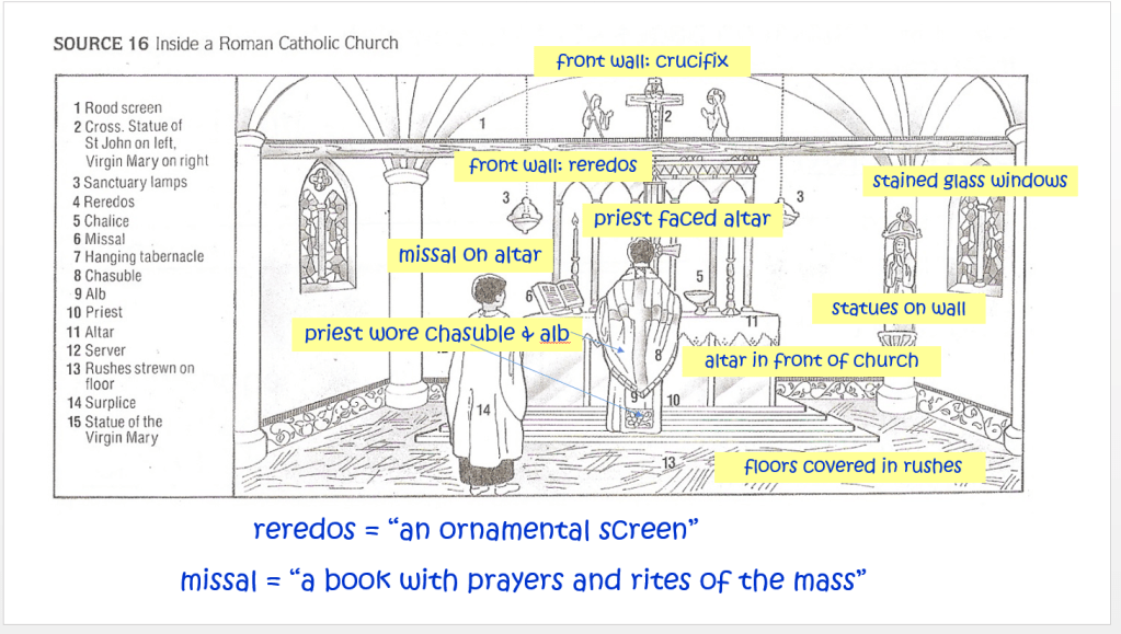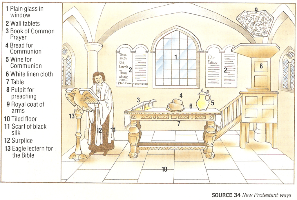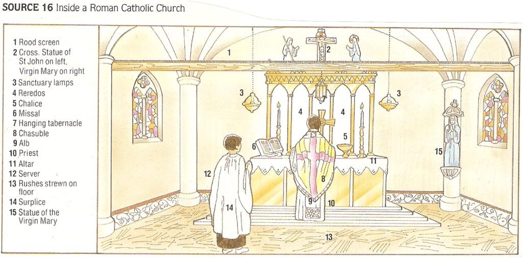 Carefully look at the differences made to the inside of the new Elizabethan Church. Then complete question 8 on page 62 by listing the differences between the interior of Elizabeth’s church and that of the Roman Catholic Church. (Use the table on p.62 for this task.)