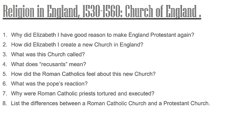 To test your knowledge on how Queen Elizabeth I made England Protestant again, complete the following tasks on the “Church of England”…