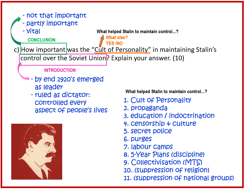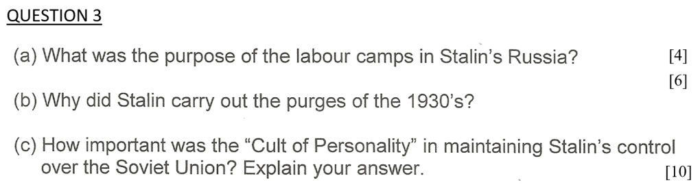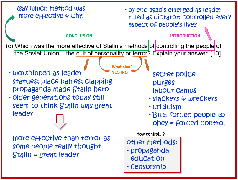 (c) Which was the more effective of Stalin’s methods of controlling the people of the Soviet Union – the cult of personality or terror? Explain your answer. [10]