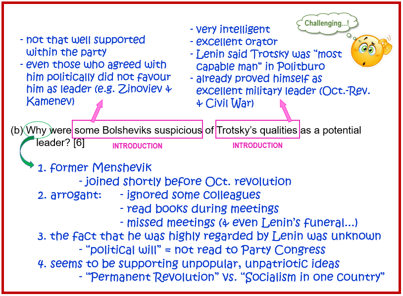 (b) Why were some Bolsheviks suspicious of Trotsky’s qualities as a potential leader? [6]