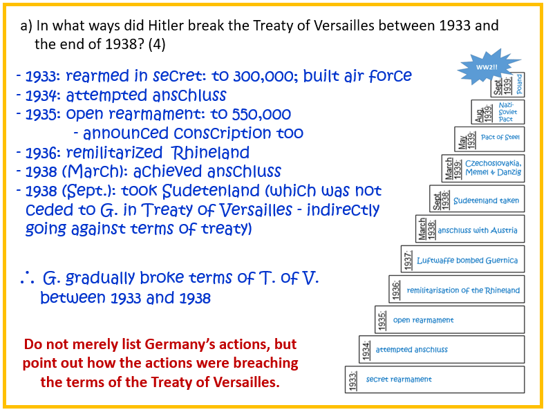 In what ways did Hitler break the Treaty of Versailles between 1933 and the end of 1938? [4]