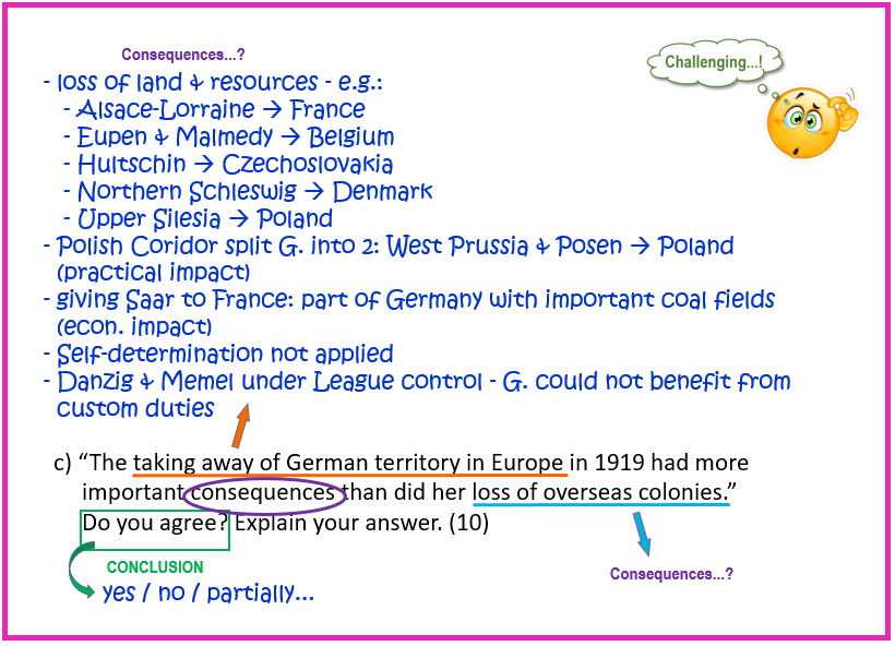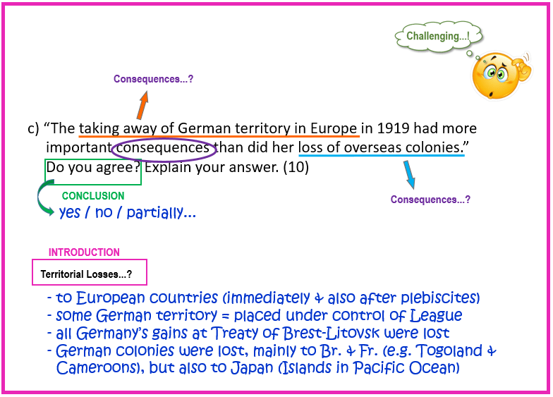 “The taking away of German territory in Europe in 1919 had more important consequences than did her loss of overseas colonies.” Do you agree? Explain your answer fully. [10]